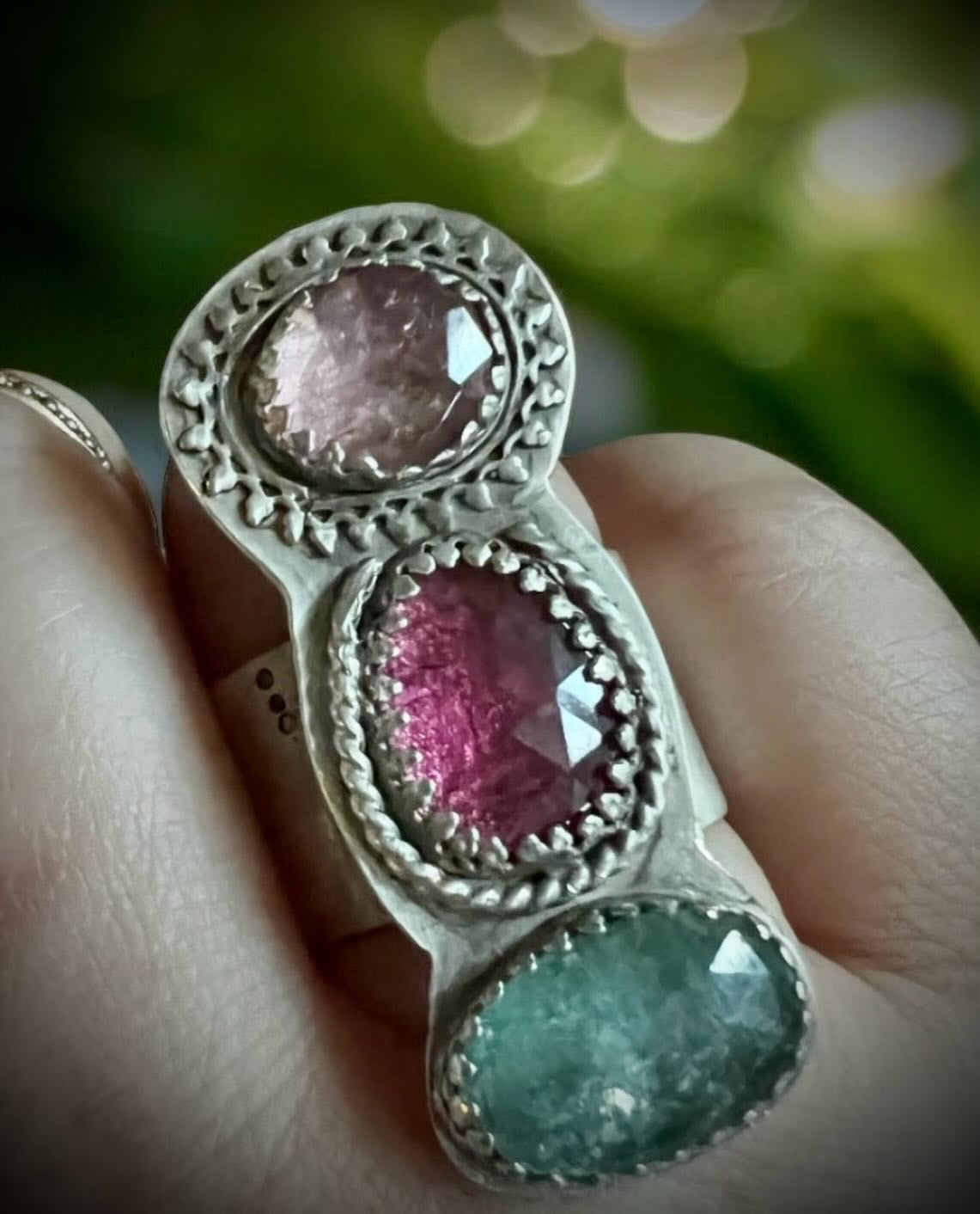 Sterling silver adjustable band statement ring with light and dark pink tourmaline and icy blue kyanite gemstones. The adjustable band, which wraps around the inside of the band ensuring a seamless look, has been hand stamped and antiqued. This ring is best suited to sizes 8-10.